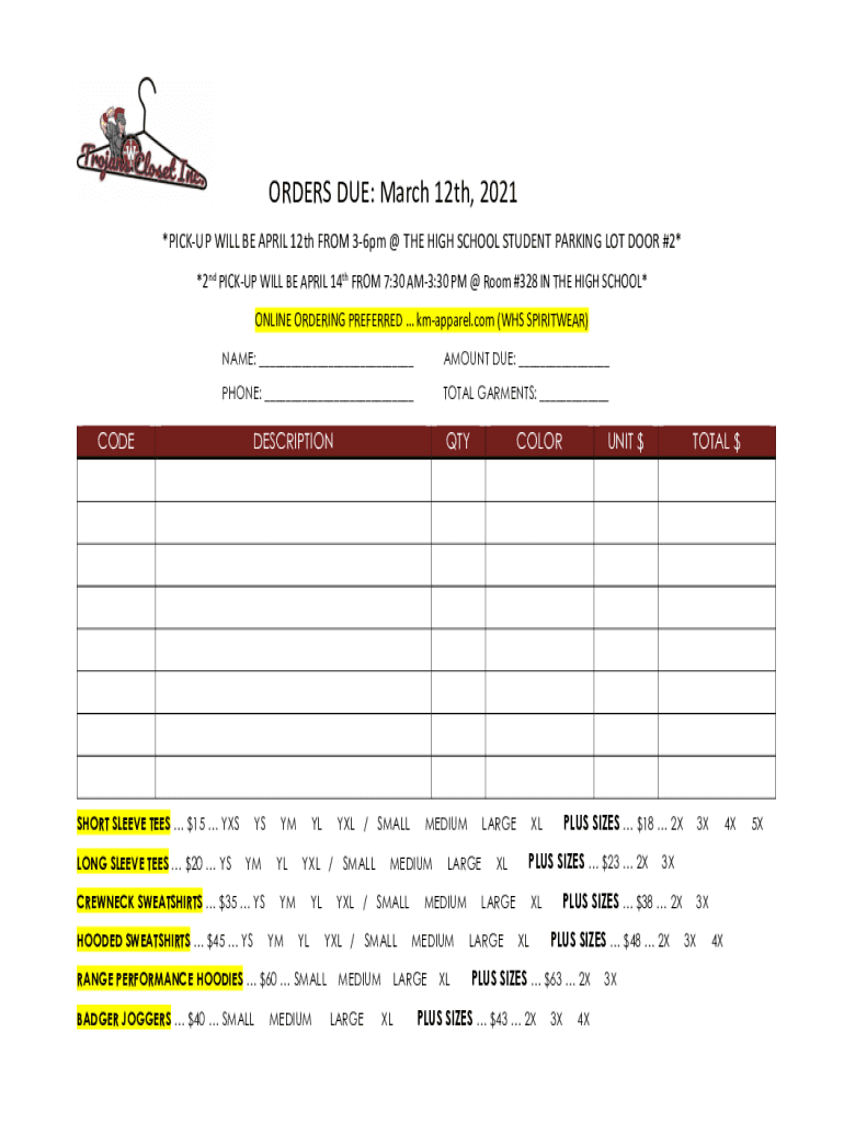 ORDERS DUE: March 12th, 2021 *PICKUP WILL BE APRIL 12th FROM 36pm THE HIGH SCHOOL STUDENT PARKING LOT DOOR #2* *2nd PICKUP WILL BE APRIL 14th FROM 7:30 AM3:30 PM Room #328 IN THE HIGH SCHOOL* ONLINE