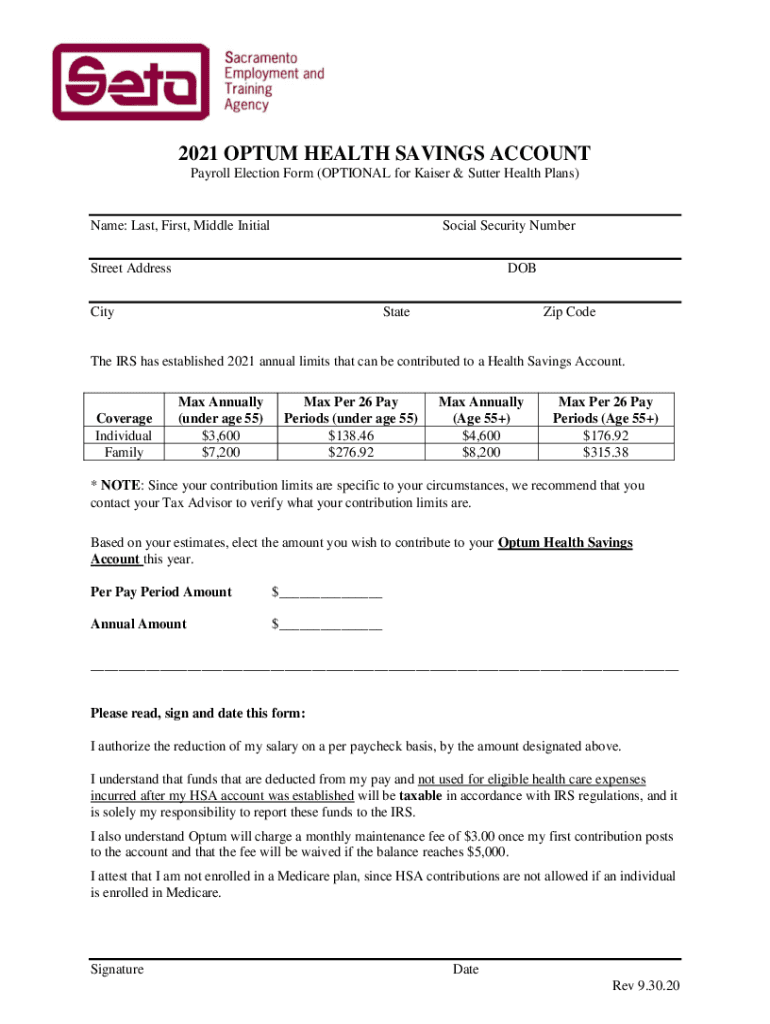 2021 OPIUM HEALTH SAVINGS ACCOUNT Payroll Election Form (OPTIONAL for Kaiser & Sutter Health Plans)Name: Last, First, Middle InitialSocial Security NumberStreet AddressDOBCityStateZip Goethe IRS has