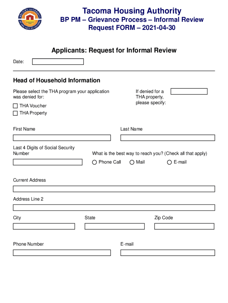 Tacoma Housing Authority BP PM Grievance Process Informal Review Request FORM 20210430 Applicants: Request for Informal Review Date:Head of Household Information Please select the THA program your