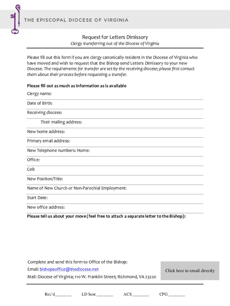 Request for Letters DimissoryClergy transferring out of the Diocese of Virginia Please fill out this form if you are clergy canonically resident in the Diocese of Virginia who have moved and wish