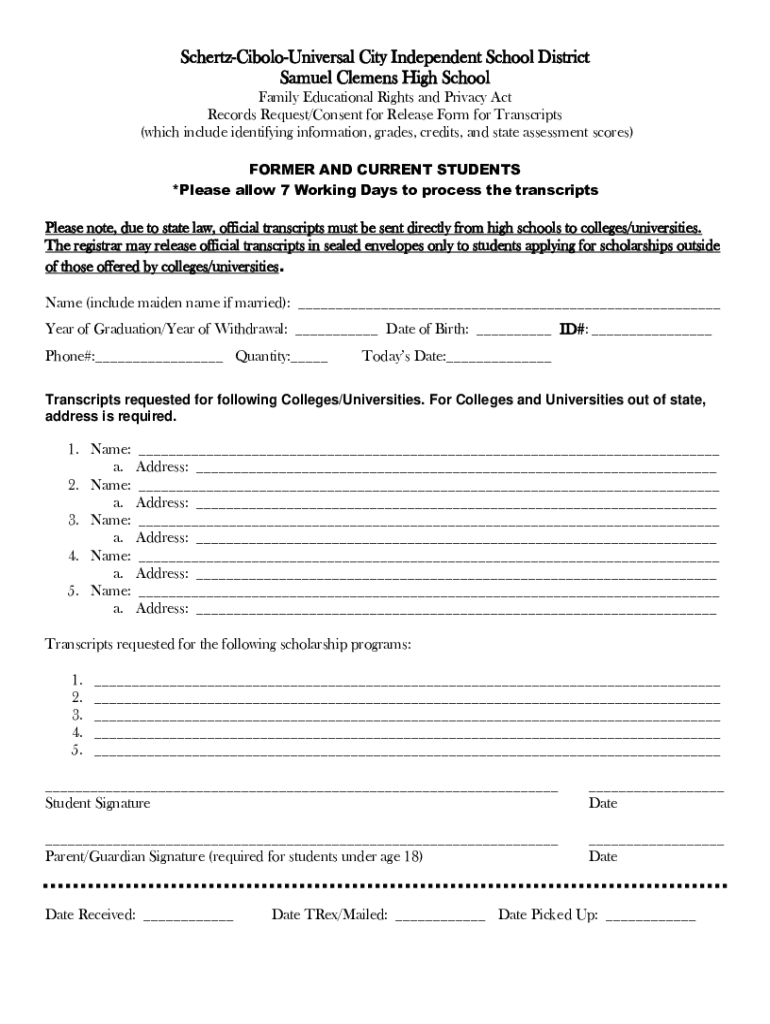 SchertzCiboloUniversal City Independent School District Samuel Clemens High School Family Educational Rights and Privacy Act Records Request/Consent for Release Form for Transcripts (which include