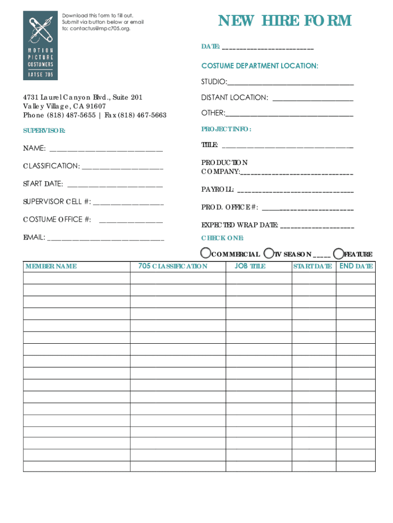 NEW HIRE Redownload this form to fill out. Submit via button below or email to: contacts mpc705.org. SUBMIT to 705DATE: CLEAR FORMCOSTUME DEPARTMENT LOCATION: STUDIO: 4731 Laurel Canyon Blvd., Suite