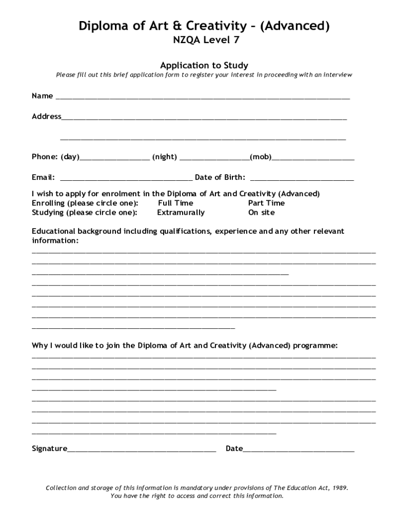 Diploma of Art & Creativity (Advanced) NZ QA Level 7 Application to Study Please fill out this brief application form to register your interest in proceeding with an interviewee Address Phone: (day)