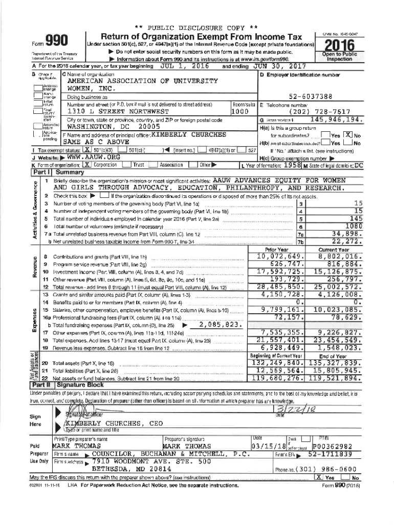 AMERICAN ASSOCIATION OF UNIVERSITY WOMEN, INC. Form 990 (2016) Part III Statement of Program Service Accomplishments 1526037388Check if Schedule O contains a response or note to any line in this Part