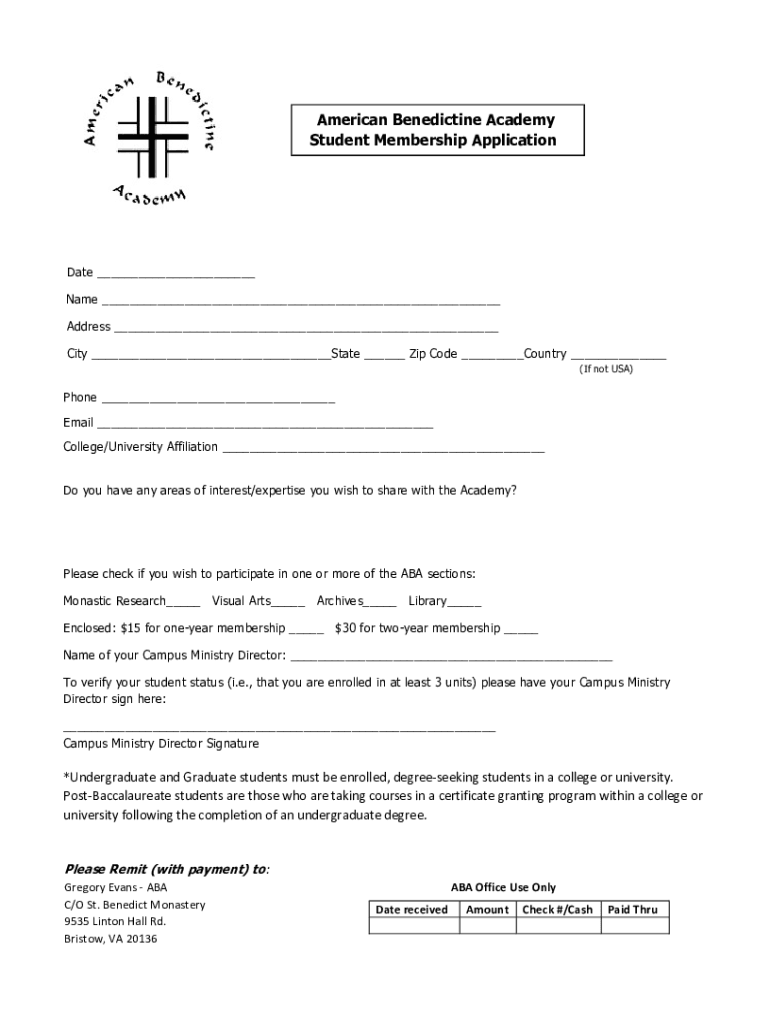 American Benedictine Academy Student Membership ApplicationDate Name Address City State Zip Code Country (If not USA)Phone Email College/University Affiliation Do you have any areas of interest/expertise