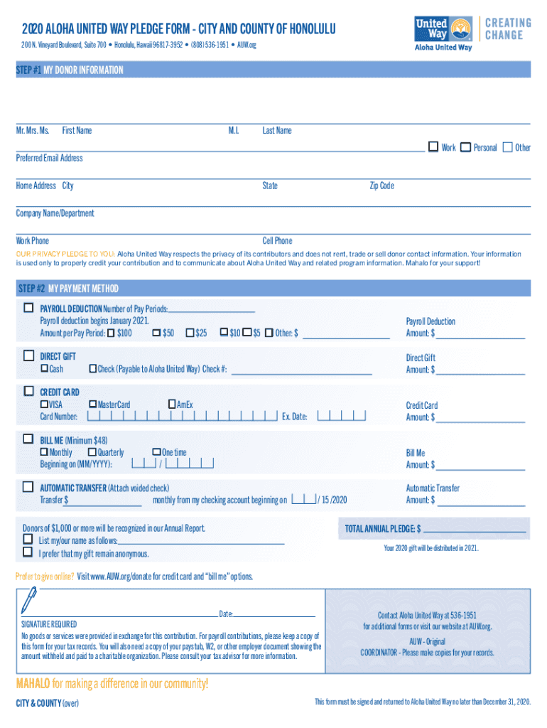 2020 ALOHA UNITED WAY PLEDGE FORM CITY AND COUNTY OF HONOLULU 200 N. Vineyard Boulevard, Suite 700 Honolulu, Hawaii 968173952 (808) 5361951 AUW. Orestes #1 MY DONOR INFORMATION Mr. Mrs. Ms. First