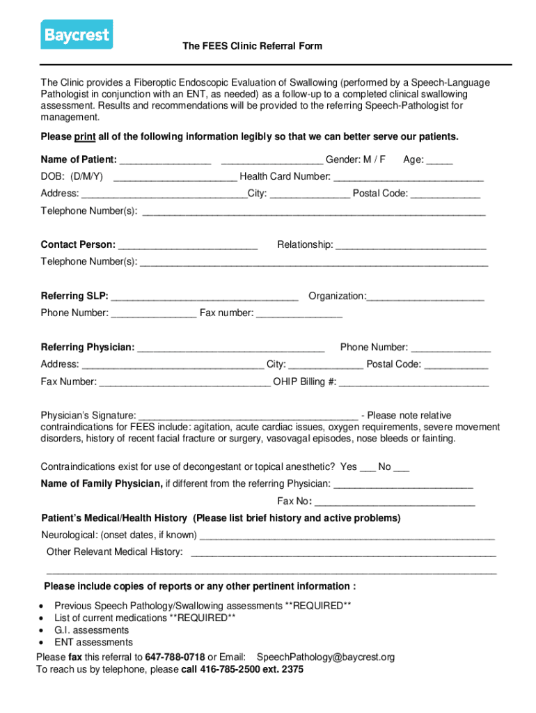 The FEES Clinic Referral Forth Clinic provides a Fiber optic Endoscopic Evaluation of Swallowing (performed by a SpeechLanguage Pathologist in conjunction with an ENT, as needed) as a followup to