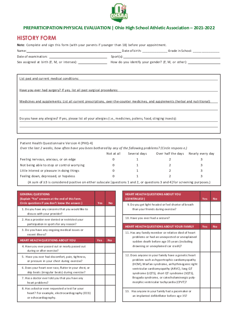 PARTICIPATION PHYSICAL EVALUATION Ohio High School Athletic Association 20212022HISTORY FORM Note: Complete and sign this form (with your parents if younger than 18) before your appointment. Name: