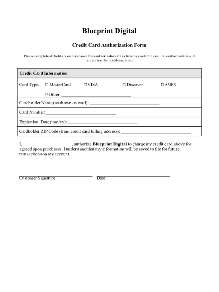 Blueprint Digital Credit Card Authorization Form Please complete all fields. You may cancel this authorization at any time by contacting us. This authorization will remain in effect until cancelled.