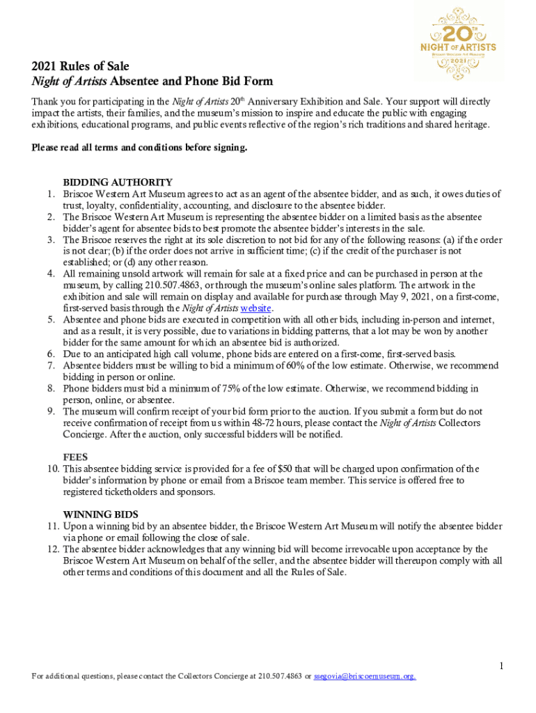 2021 Rules of Sale Night of Artists Absentee and Phone Bid Form Thank you for participating in the Night of Artists 20th Anniversary Exhibition and Sale. Your support will directly impact the artists,