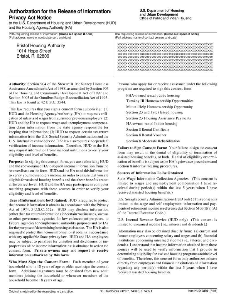 U.S. Department of Housing and Urban Development Office of Public and Indian HousingAuthorization for the Release of Information/ Privacy Act Notice to the U.S. Department of Housing and Urban Development