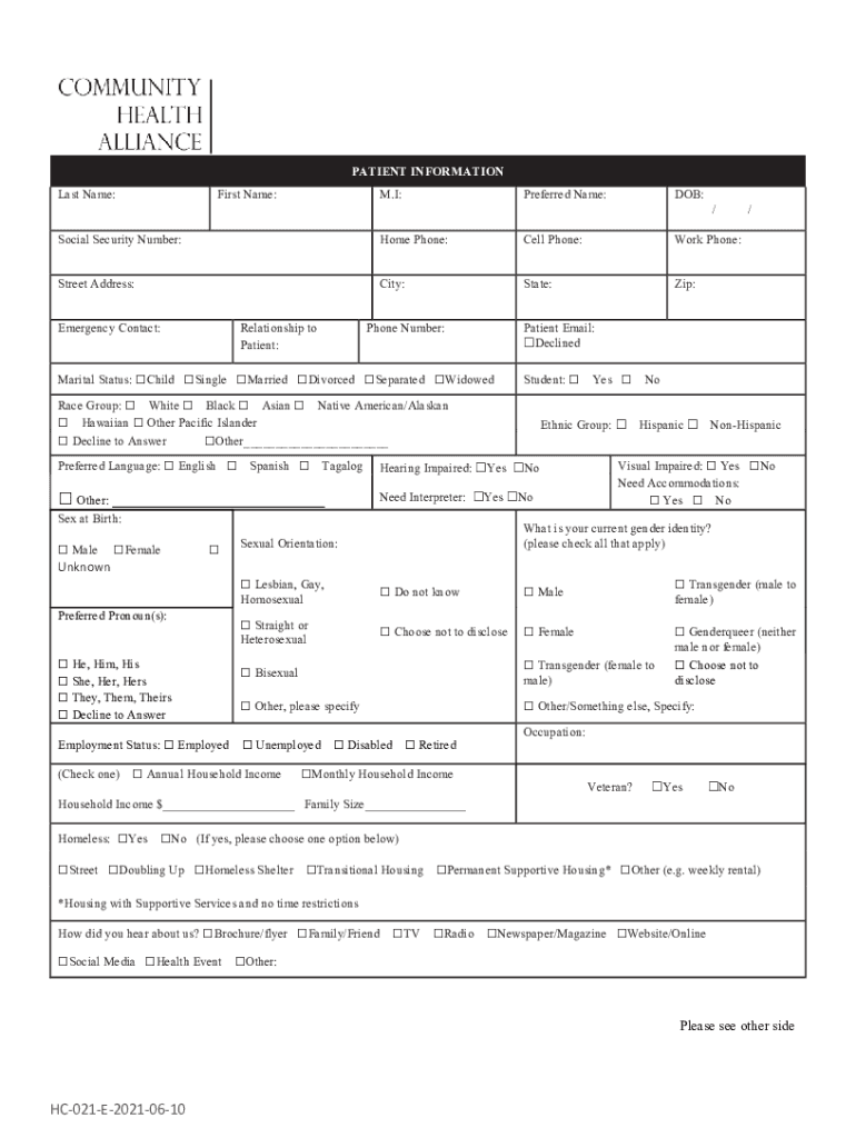 PATIENT INFORMATION Last Name:First Name’M. I:Preferred Name:DOB:Social Security Number:Home Phone:Cell Phone:Work Phone:Street Address:City:State:Zip:Emergency Contact:Relationship to Patient:Phone