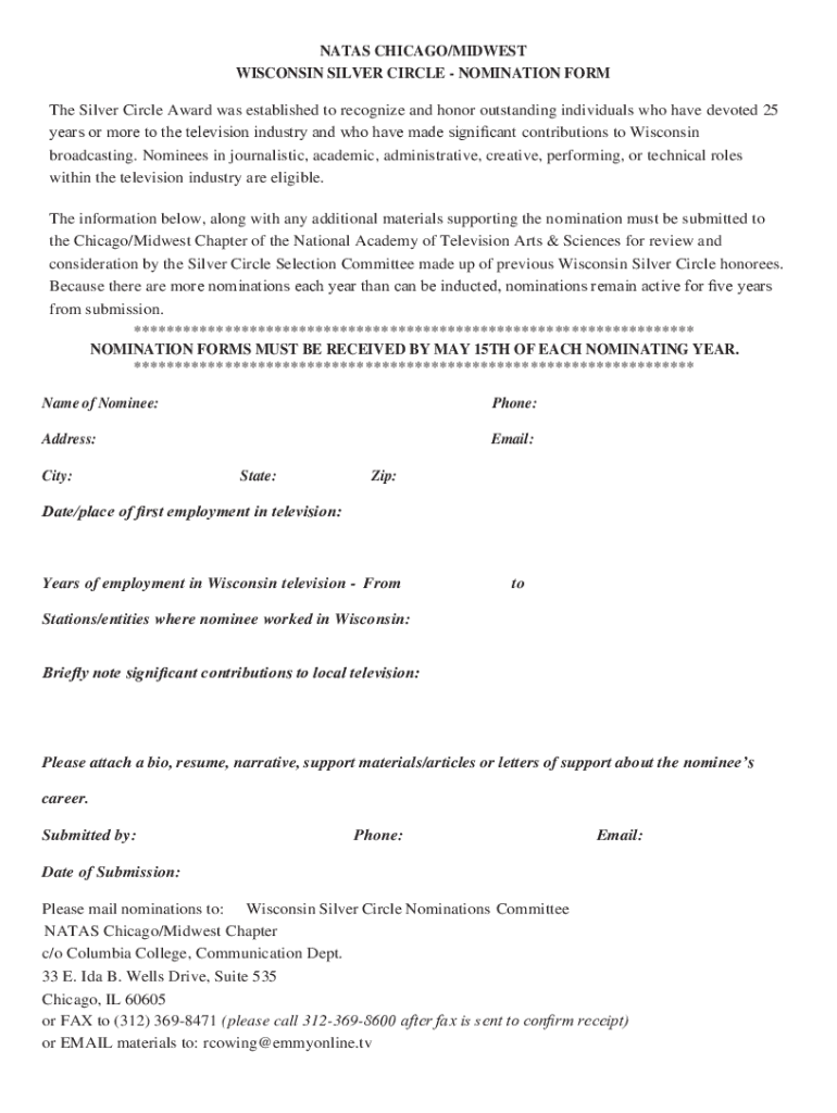NATAL CHICAGO/MIDWEST WISCONSIN SILVER CIRCLE NOMINATION From The Silver Circle Award was established to recognize and honor outstanding individuals who have devoted 25 years or more to the television
