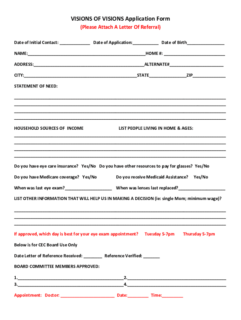 VISIONSOFVISIONSApplicationForm (PleaseAttachALetterOfReferral) DateofInitialContact: DateofApplication: DateofBirth NAME: HOME#: ADDRESS: ALTERNATE# CITY: STATE ZIP STATEMENTOFNEED: HOUSEHOLDSOURCESOFINCOME