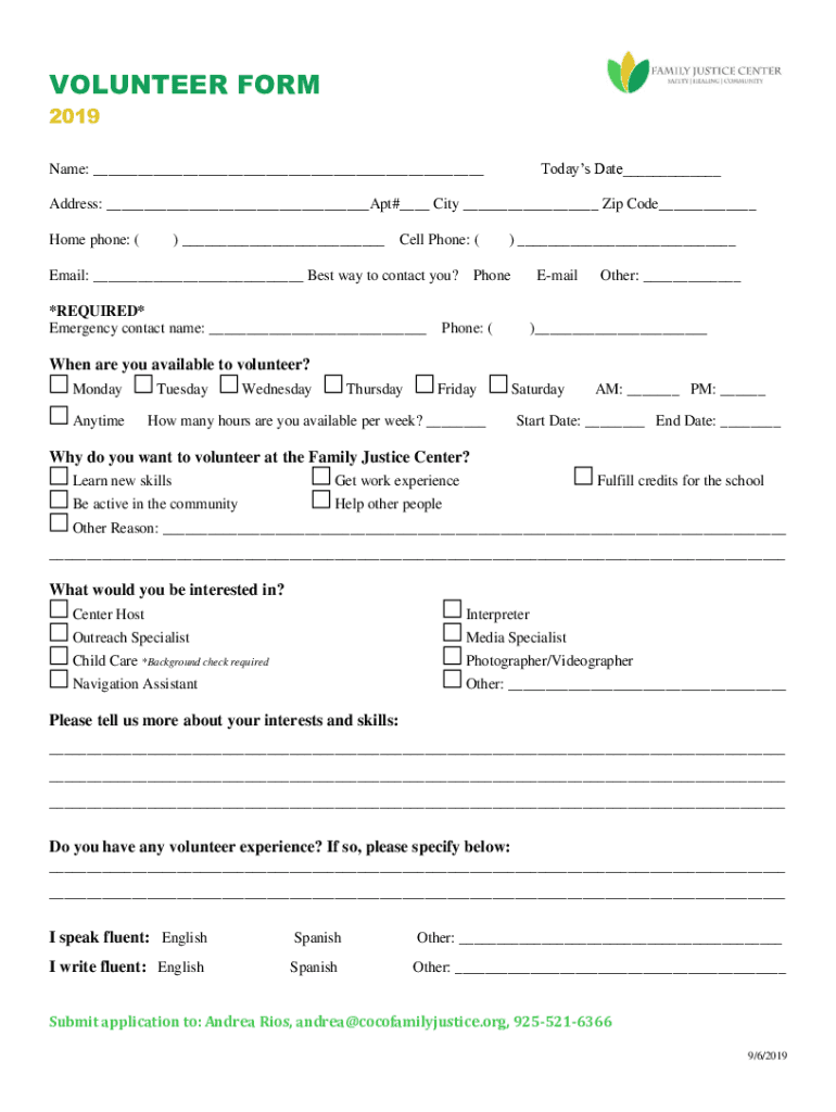 VOLUNTEER FORM 2019 Today's Date Name: Address: Apt# City Zip Code Home phone: () Cell Phone: () Email: the Best way to contact you? Phone *REQUIRED* Emergency contact name: Phone: (EmailOther:) When