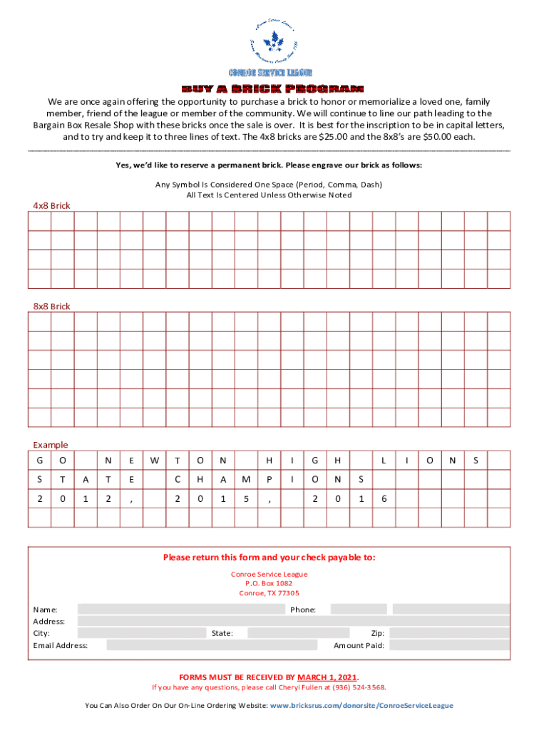 CONROE SERVICE League are once again offering the opportunity to purchase a brick to honor or memorialize a loved one, family member, friend of the league or member of the community. We will continue
