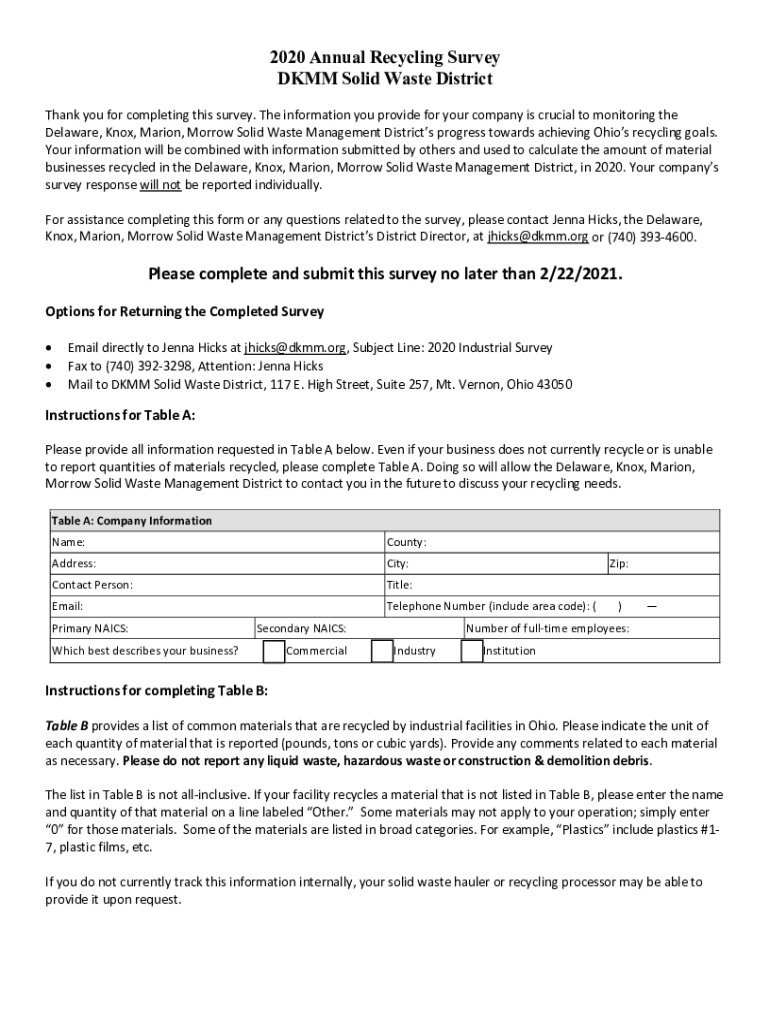 2020 Annual Recycling Survey DIMM Solid Waste District Thank you for completing this survey. The information you provide for your company is crucial to monitoring the Delaware, Knox, Marion, Morrow