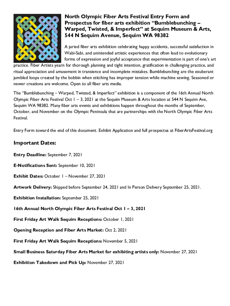 North Olympic Fiber Arts Festival Entry Form and Prospectus for fiber arts exhibition Bumble bunching Warped, Twisted, & Imperfect at Sequin Museum & Arts, 544 N Sequin Avenue, Sequin WA 98382 A buried