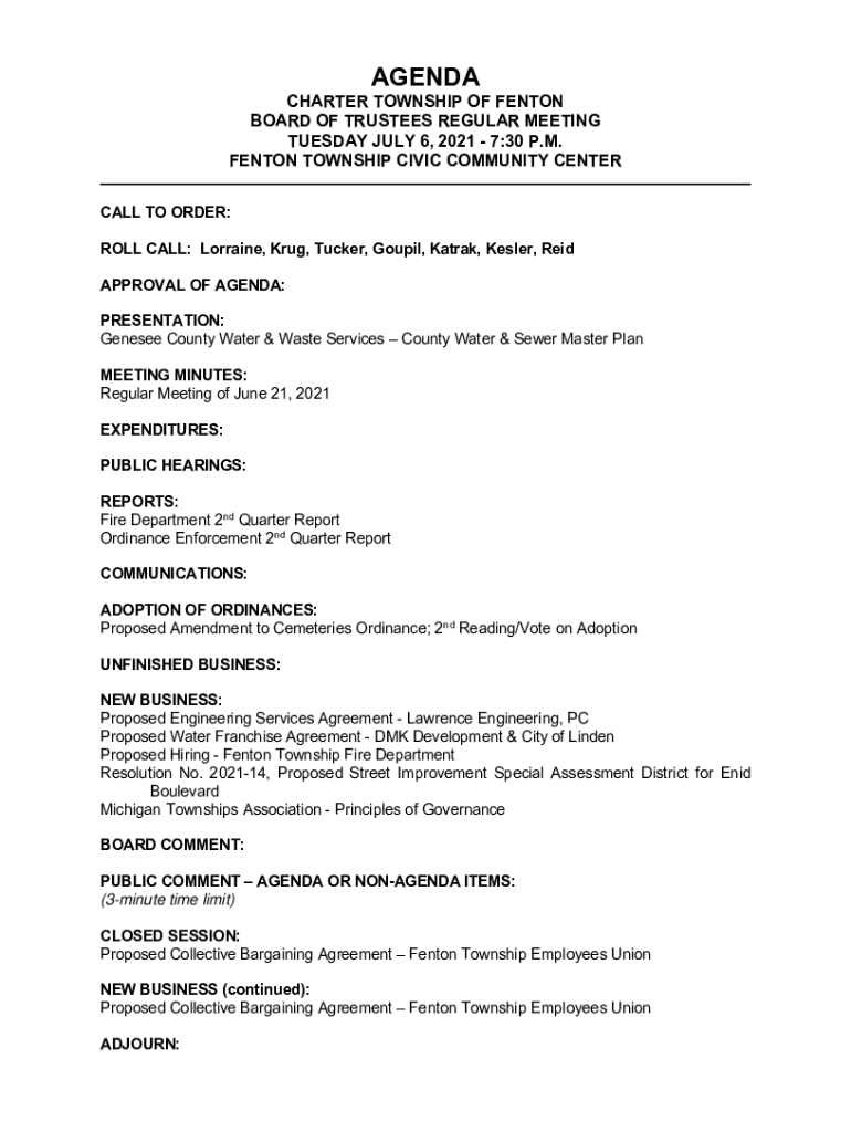 AGENDA CHARTER TOWNSHIP OF BENTON BOARD OF TRUSTEES REGULAR MEETING TUESDAY, JULY 6, 2021 7:30 P.M. BENTON TOWNSHIP CIVIC COMMUNITY CENTER CALL TO ORDER: ROLL CALL: Lorraine, Drug, Tucker, Gospel,