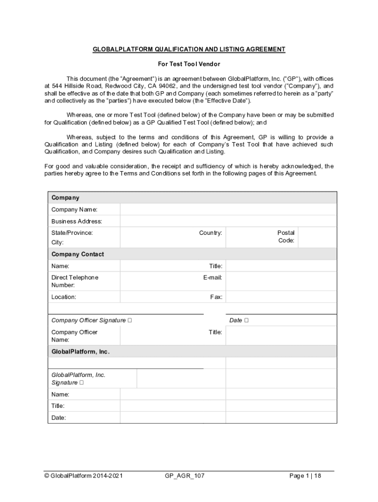 GLOBALPLATFORM QUALIFICATION AND LISTING AGREEMENT For Test Tool Vendor This document (the Agreement) is an agreement between GlobalPlatform, Inc. (GP), with offices at 544 Hillside Road, Redwood