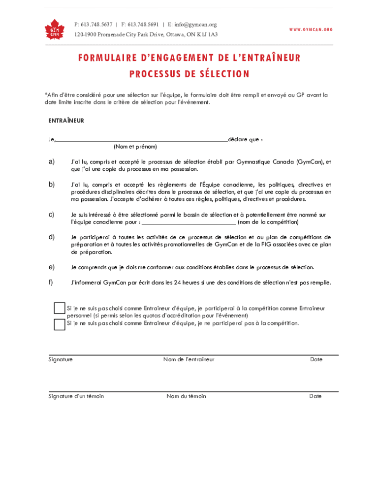 P: 613.748.5637 F: 613.748.5691 E: info gym can.org 1201900 Promenade City Park Drive, Ottawa, ON K1J 1A3WWW.GYM CAN.ORGFORMULAIRE ENGAGEMENT DE L ENTRANCE PROCESSES DE S ELECTION *Akin dare consider