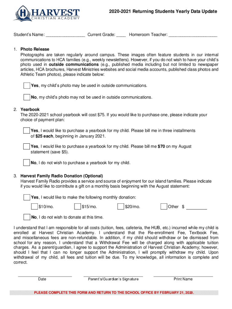 Get the free Yearly Data Update Form - Harvest Christian Academy