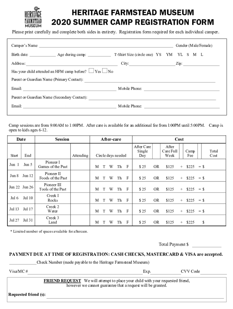 HERITAGE FARMSTEAD MUSEUM 2020 SUMMER CAMP REGISTRATION FORM Please print carefully and complete both sides in entirety. Registration form required for each individual camper. Campers Nameserver (Male/Female)Birth
