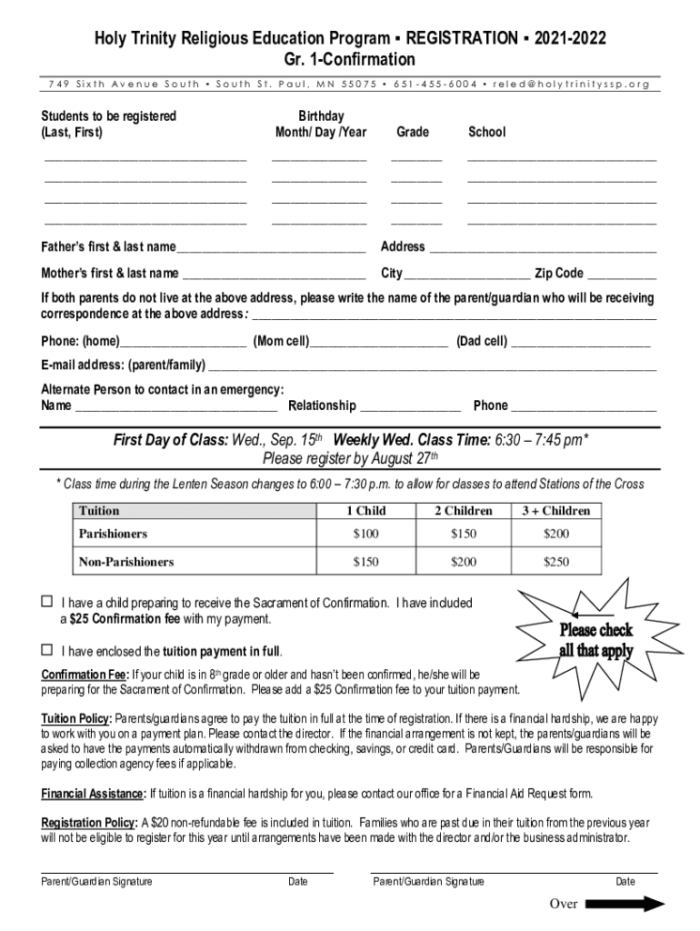 Holy Trinity Religious Education Program REGISTRATION 20212022 Gr. 1Confirmation 749 Sixth Avenue South St. Paul, MN 55075 6514556004 ruled holytrinityssp. Students to be registered (Last, First)Birthday