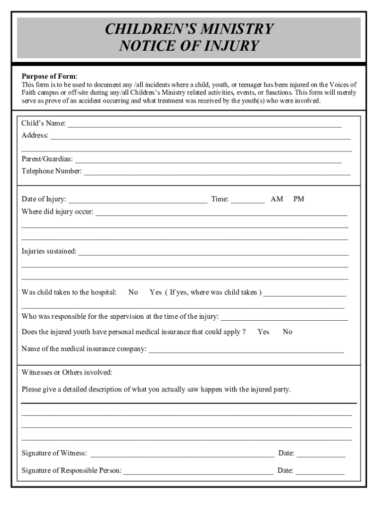 CHILDREN MINISTRY NOTICE OF INJURY Purpose of Form: This form is to be used to document any /all incidents where a child, youth, or teenager has been injured on the Voices of Faith campus or offsite