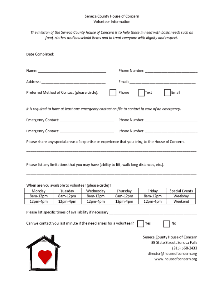 Seneca County House of Concern Volunteer Information The mission of the Seneca County House of Concern is to help those in need with basic needs such as food, clothes and household items and to treat