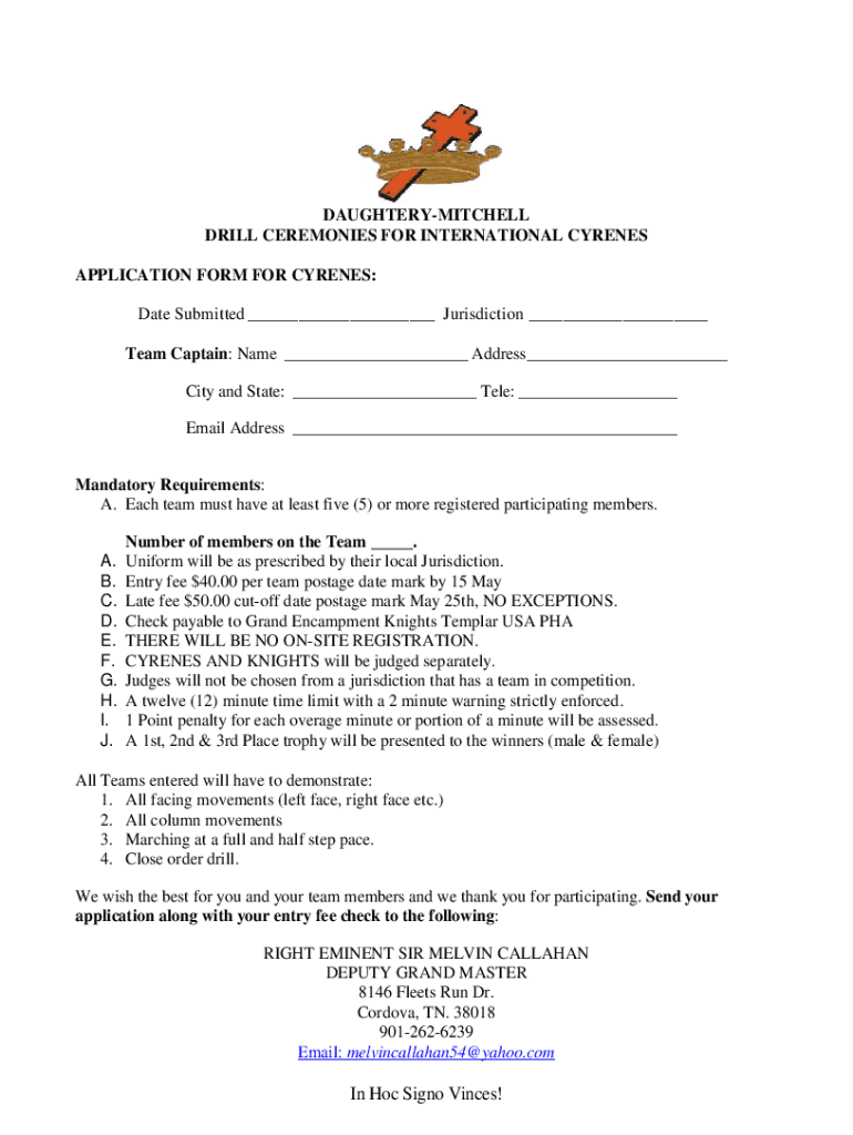 DAUGHTERYMITCHELL DRILL CEREMONIES FOR INTERNATIONAL CRANES APPLICATION FORM FOR CRANES: Date Submitted Jurisdiction Team Captain: Name Address City and State: Tell: Email Address Mandatory Requirements: