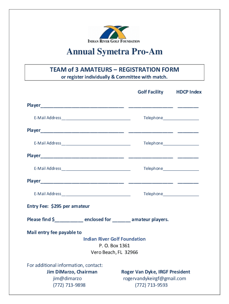 Annual Symmetry Roam TEAM of 3 AMATEURS REGISTRATION FORM or register individually & Committee with match. Golf Facility HDCP Underplayed Email Address Telephone Player Email Address Telephone Player