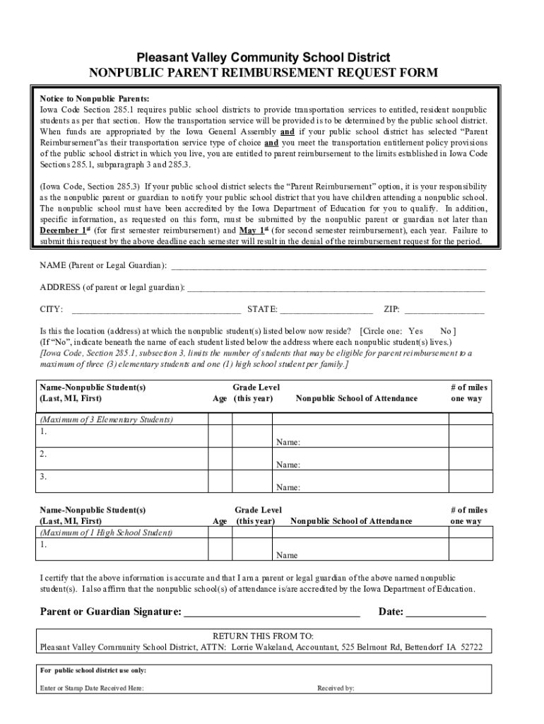 Pleasant Valley Community School District NONPUBLIC PARENT REIMBURSEMENT REQUEST FORM Notice to Nonpublic Parents: Iowa Code Section 285.1 requires public school districts to provide transportation