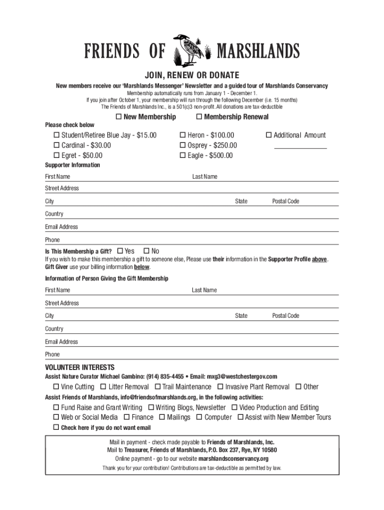 FRIENDS OFMARSHLANDSJOIN, RENEW OR DONATE New members receive our Marshlands Messenger Newsletter and a guided tour of Marshlands Conservancy Membership automatically runs from January 1 December