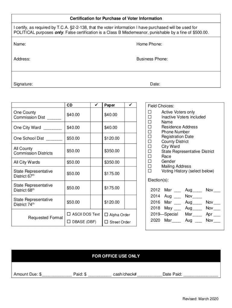 Certification for Purchase of Voter Information I certify, as required by T.C.A. 22138, that the voter information I have purchased will be used for POLITICAL purposes only. False certification is