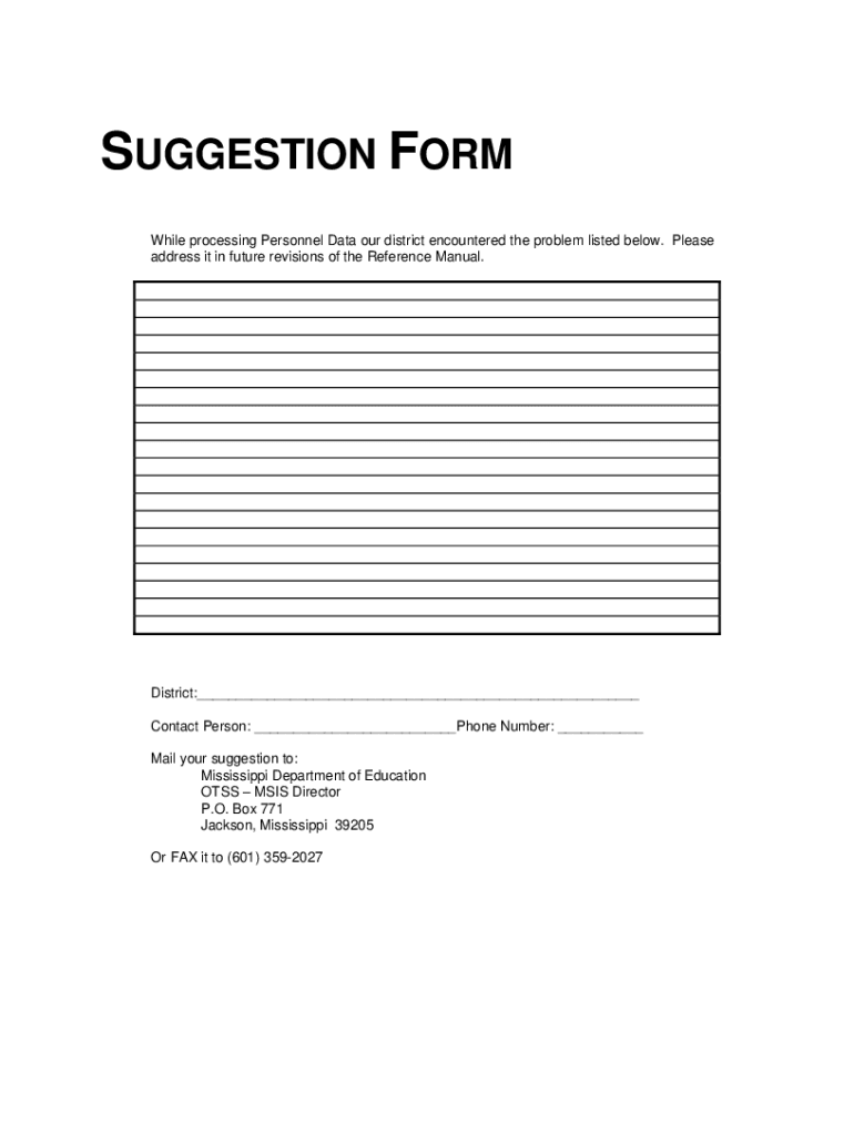 SUGGESTION FORM While processing Personnel Data our district encountered the problem listed below. Please address it in future revisions of the Reference Manual. District: Contact Person: Phone Number: