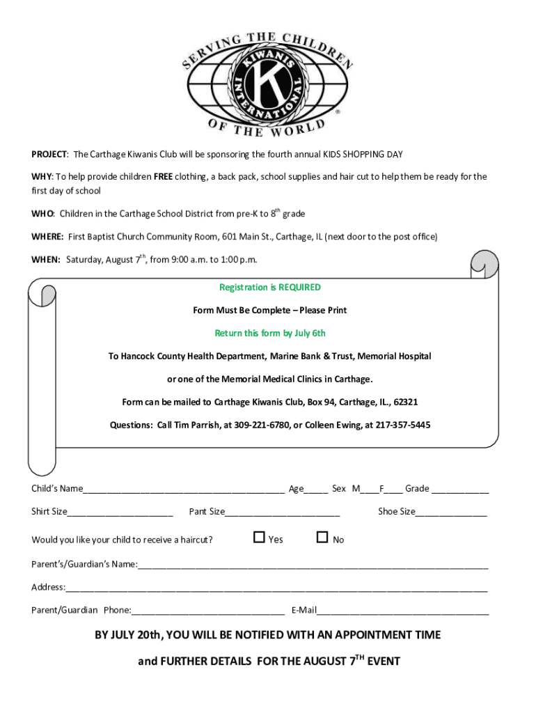 PROJECT: The Carthage Kiwanis Club will be sponsoring the fourth annual KIDS SHOPPING DAY WHY: To help provide children FREE clothing, a backpack, school supplies and hair cut to help them be ready