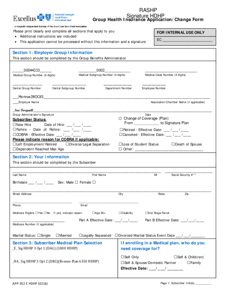 RASH Signature HDHPGroup Health Insurance Application/Change Form Please print clearly and complete all sections that apply to you Additional instructions are included This application cannot be processed
