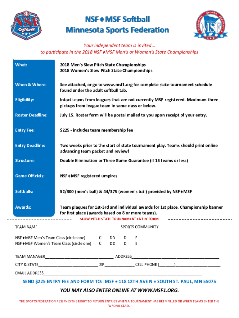 NSF MSF Softball Minnesota Sports Federation Your independent team is invited to participate in the 2018 NSF MSF Men or Women's State Championships What:2018 Men Slow Pitch State Championships 2018