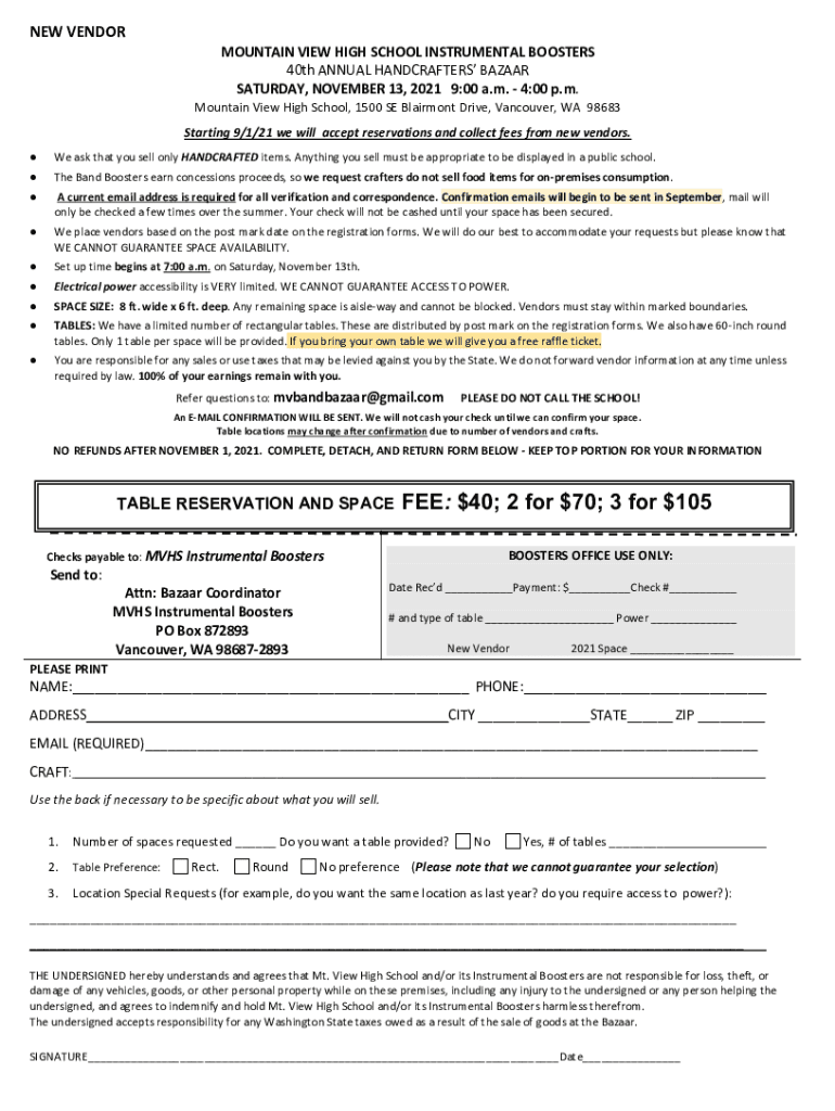 NEW VENDORMOUNTAIN VIEW HIGH SCHOOL INSTRUMENTAL BOOSTERS 40th ANNUAL HANDCRAFT ERS BAZAAR SATURDAY, NOVEMBER 13, 2021 9:00 a.m. 4:00 p.m. Mountain View High School, 1500 SE Claremont Drive, Vancouver,