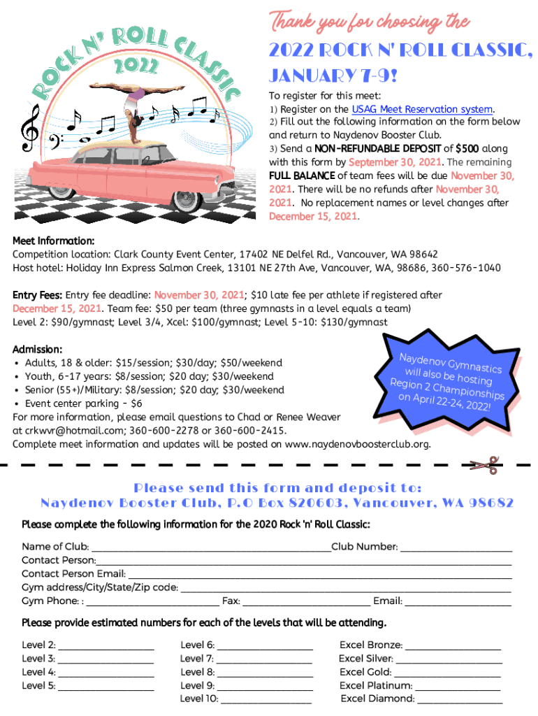 Thank you for choosing the 2022 ROCK N\' ROLL CLASSIC, JANUARY 79! To register for this meet: 1) Register on the USAGE Meet Reservation system. 2) Fill out the following information on the form below