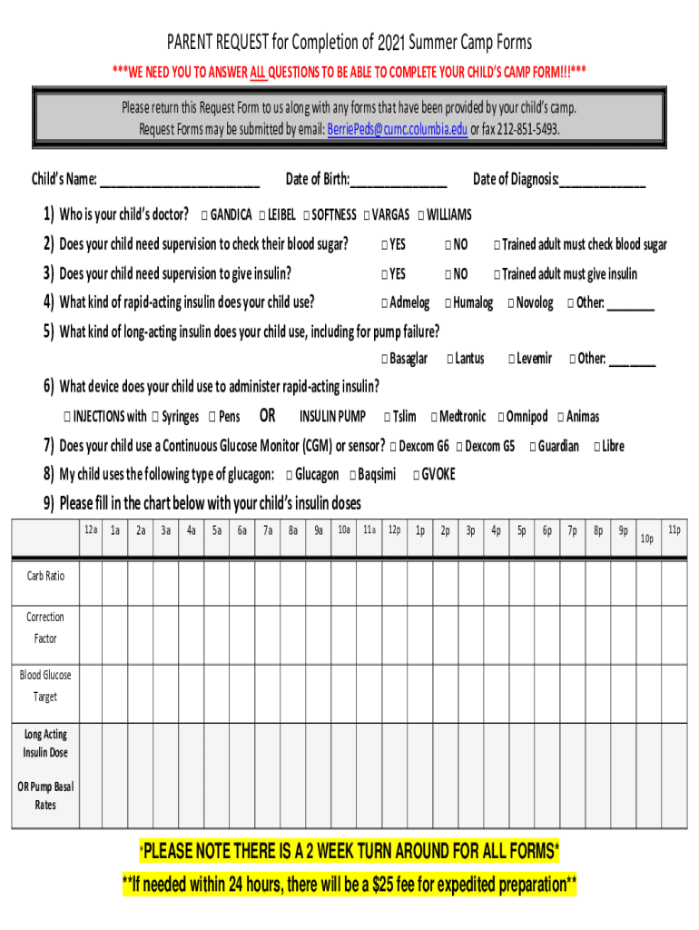 PARENT REQUEST for Completion of 2020 2021 Summer Camp Forms ***WE NEED YOU TO ANSWER ALL QUESTIONS TO BE ABLE TO COMPLETE YOUR CHILD SCAMP FORM!!!*** Please return this Request Form to us along with