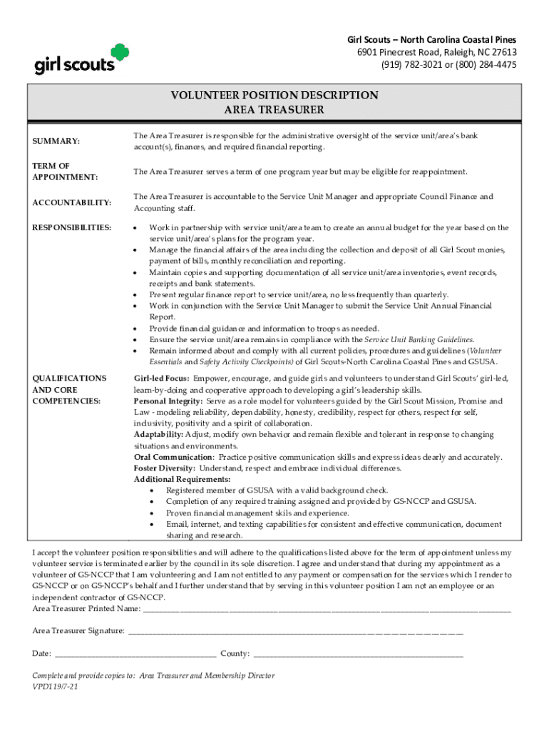 Girl Scouts North Carolina Coastal Pines 6901 Pine crest Road, Raleigh, NC 27613 (919) 7823021 or (800) 2844475VOLUNTEER POSITION DESCRIPTION AREA TREASURER SUMMARY:The Area Treasurer is responsible