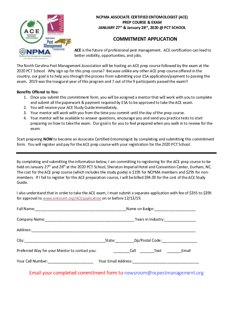 NC PMA ASSOCIATE CERTIFIED ENTOMOLOGIST (ACE) PREP COURSE & EXAM JANUARY 27th & January 28th, 2020 PCT SCHOOLCOMMITMENT APPLICATION ACE is the future of professional pest management. ACE certification