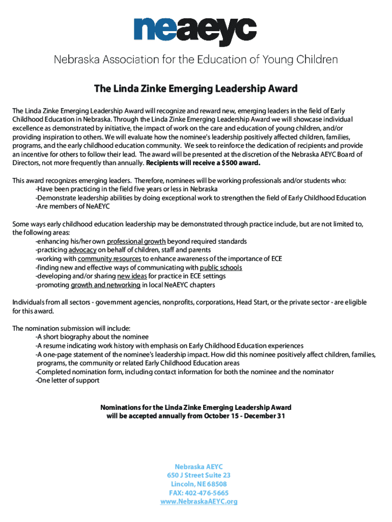 The Linda Zine Emerging Leadership Award The Linda Zine Emerging Leadership Award will recognize and reward new, emerging leaders in the field of Early Childhood Education in Nebraska. Through the