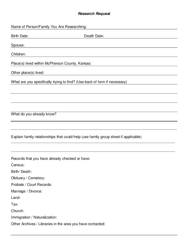 Research Sequestrate of Person/Family You Are Researching: Birth Date:Death Date:Spouse: Children: Place(s) lived within McPherson County, Kansas: Other place(s) lived: What are you specifically trying