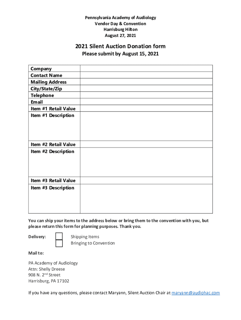 Pennsylvania Academy of Audiology Vendor Day & Convention Harrisburg Hilton August 27, 2021, Silent Auction The Pennsylvania Academy of Audiology is hosting its Annual Silent Auction. The proceeds