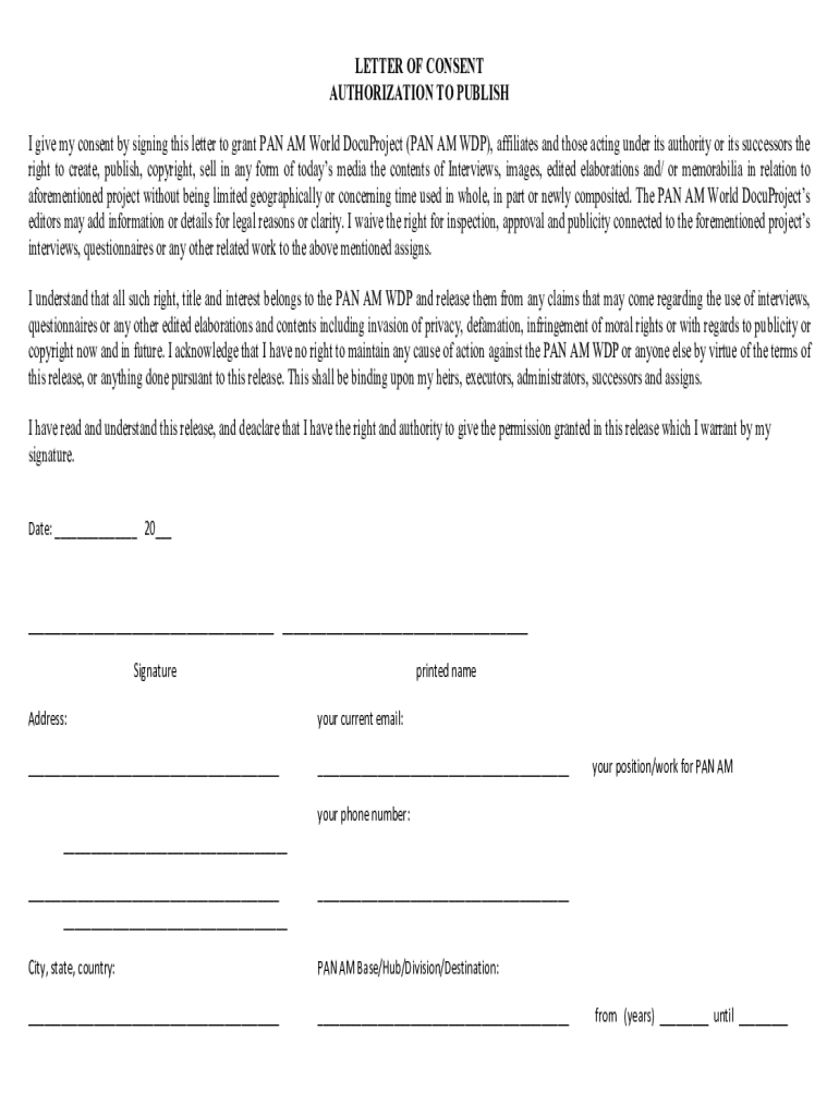 LETTER OF CONSENT AUTHORIZATION TO PUBLISH I give my consent by signing this letter to grant PAN AM World DocuProject (PAN AM GDP), affiliates and those acting under its authority or its successors