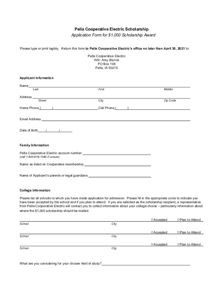 Ella Cooperative Electric Scholarship Rules and Instructions for $1,000 Scholarship Award1. There will be no discrimination on the basis of age, sex, race, national origin, creed, religion, marital