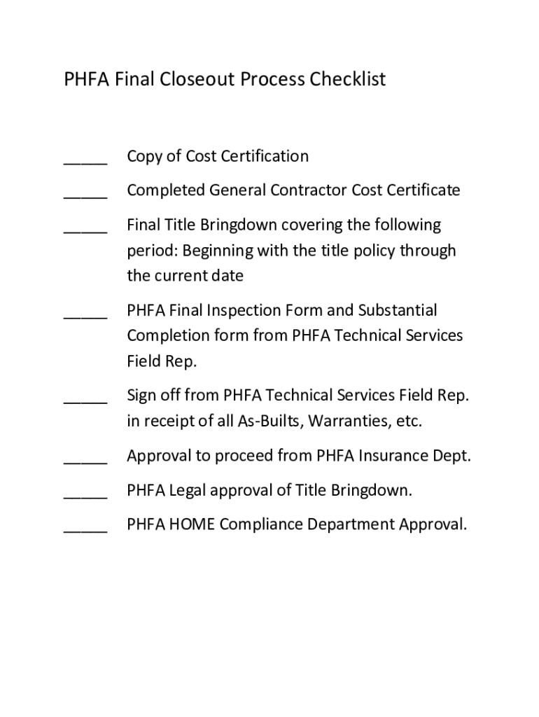 Step 6: Address any further requests or clarifications from PHFA regarding the final closeout process.